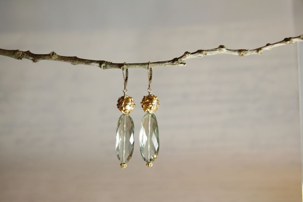And a rare gold piece. Gold vermeil beads with bold faceted green amethysts, $135