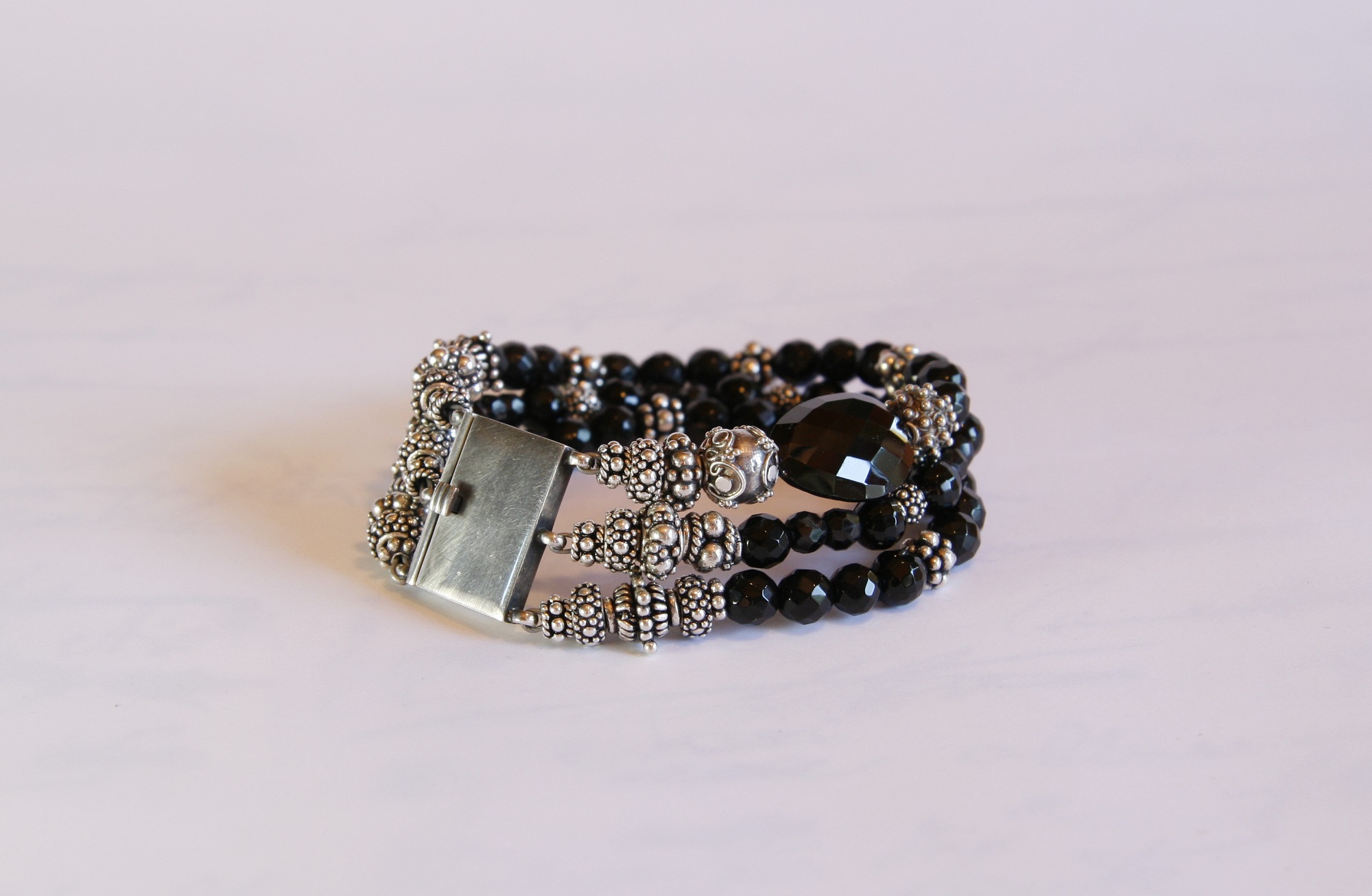 When it comes to creating jewellery, I often know how I want to use a string of beautiful gems in a necklace the moment I see them. Something about the colour or the shape inspires the piece, as was the case with this three-strand onyx bracelet, with the sterling silver beads. At other times I have a necklace or a bracelet in mind (vaguely) and I’m keeping an eye out for a stone that fits my idea. In that case, a particular size, cut, or colour is what I’m after.