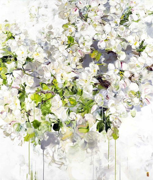 I adore her florals on huge canvases. Often, her richly coloured blossoms seem to blow in the breeze, giving a nod to the French impressionists and their fields of fleurs. In other works, her abstract suggestions of a bouquet are reminiscent of still lifes, but with a modern twist. She often paints white flowers, which I love, and it’s easy to get lost in her huge canvases. She produces the sort of paintings that are easy to live with, if you have the wall space. Most of the works I’ve seen have been more than 2 metres high and some dwarf the artist.